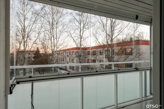 Lasitetulla parvekkeella kelpaa aamukahvista ja linnunlaulusta nauttia.