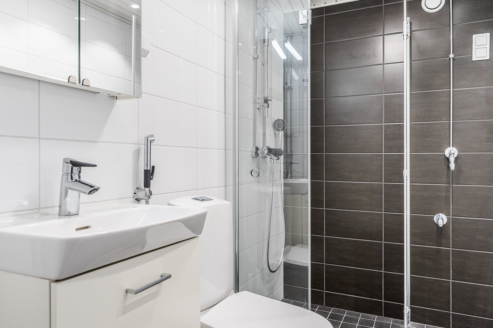 - Suihku, suihkukaappi, wc-istuin, peilikaappi, allaslaatikosto, ja pesukoneliitäntä