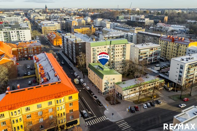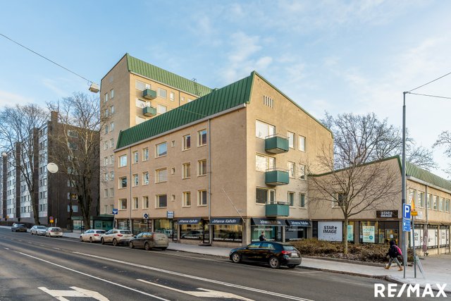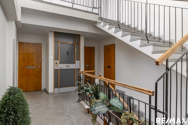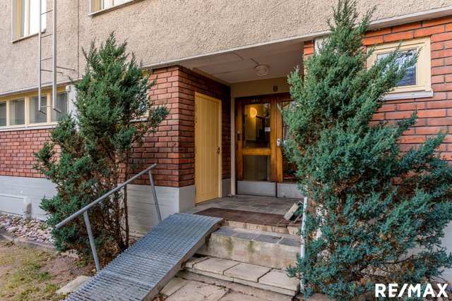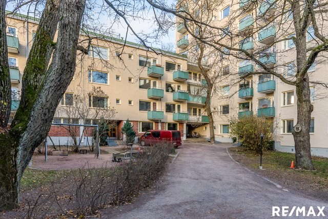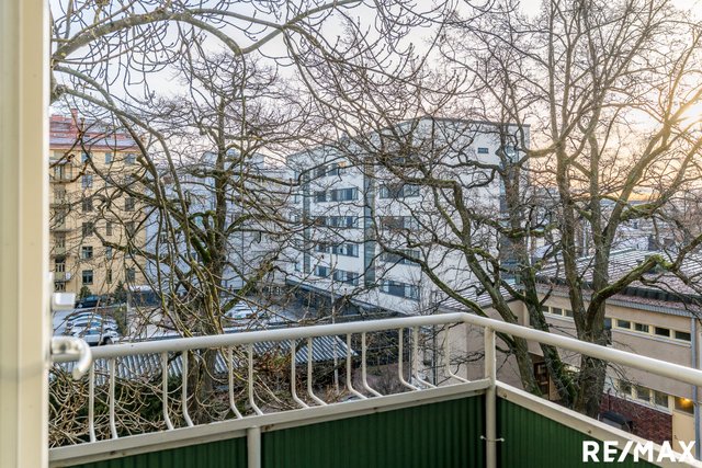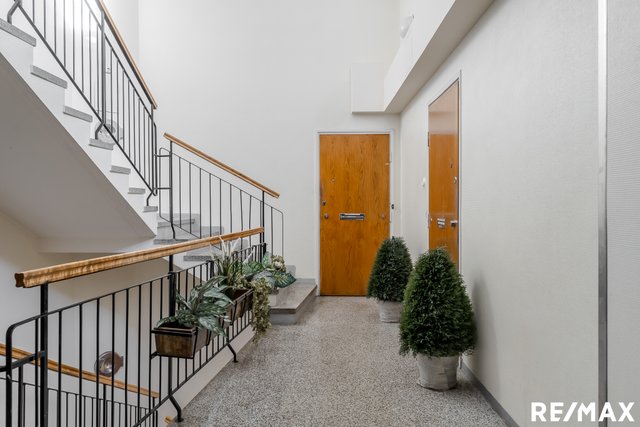 Sisäänkäynti rappukäytävään on rauhalliselta sisäpihalta. Itse asunnon ulko-oven edustalle tulvii kauniisti luonnonvaloa ja rappukäytävääkin on ylimmässä kerroksessa koristeltu, joten kotiin saapuminen tuntuu täällä tavallista juhlavammalta. Huoneistosta on näkymät kolmeen eri suuntaan ja parveke on sisäpihalle päin.