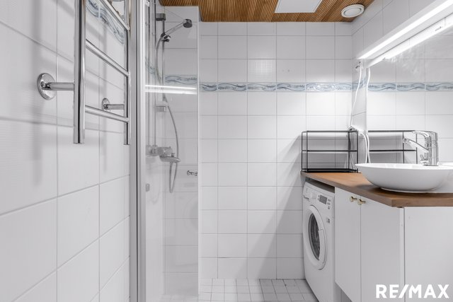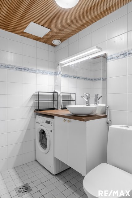 - WC-istuin, suihku, suihkuseinä, pesukoneliitäntä, lattialämmitys, peili, pesuallas, allaskaappi, ja bidee-suihku