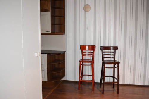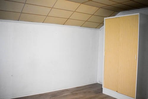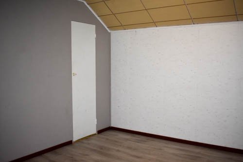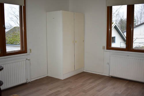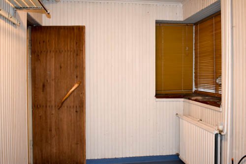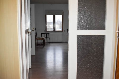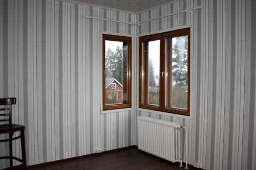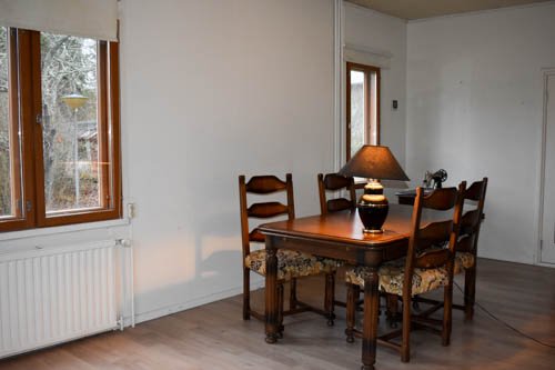 - Eteisestä toinen kulku isoon (23,94 m²) olohuoneeseen, mikä toiminut aikoinaan konttorina. Laminaattilattiat