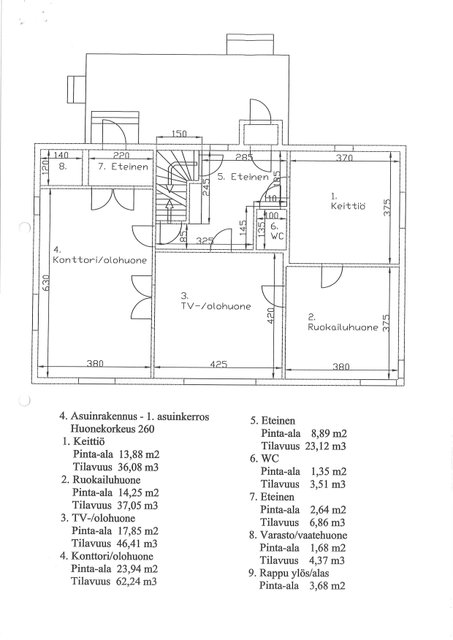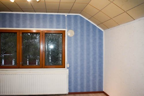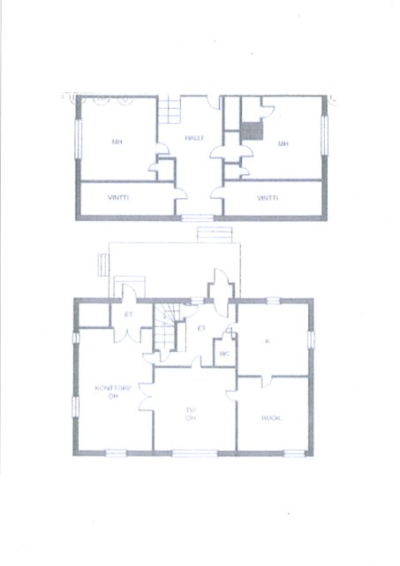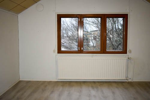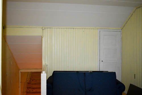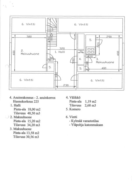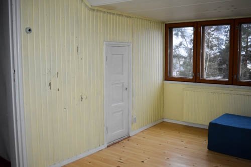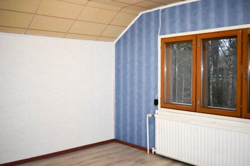 - Asuinkerroksen tv-/olohuone (17,85 m²) on toiminut makuuhuoneena, Yläkerrassa hallin lisäksi kaksi makuuhuonetta.