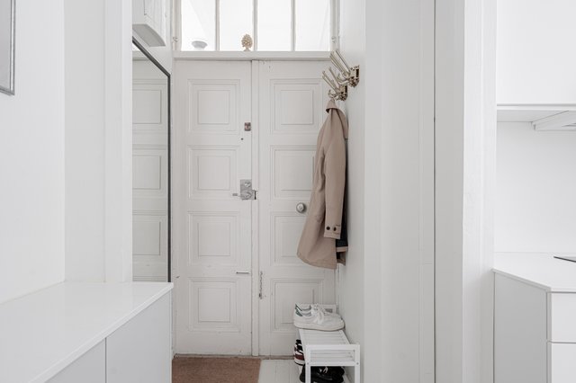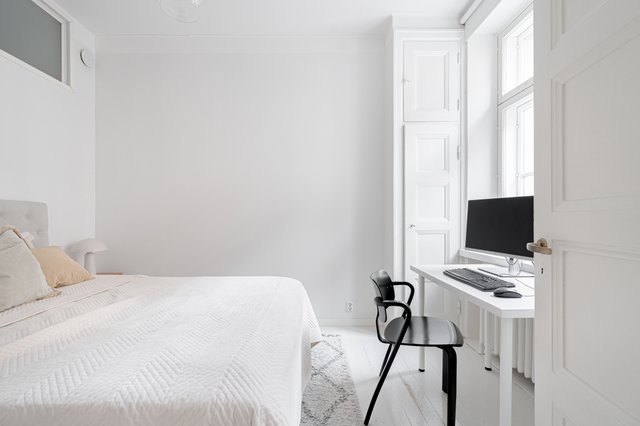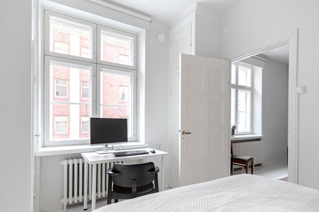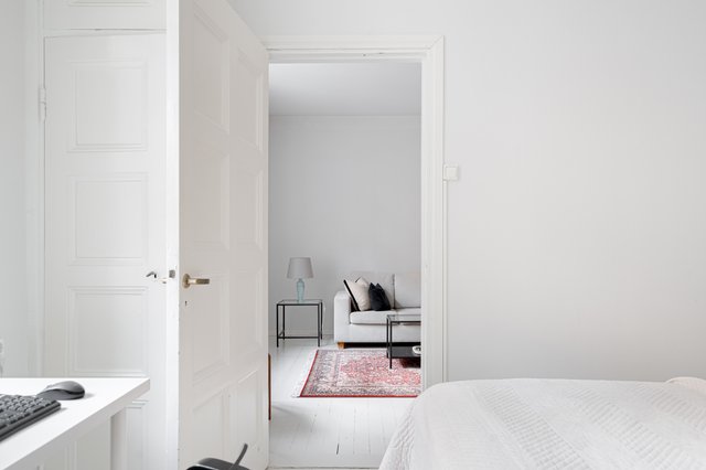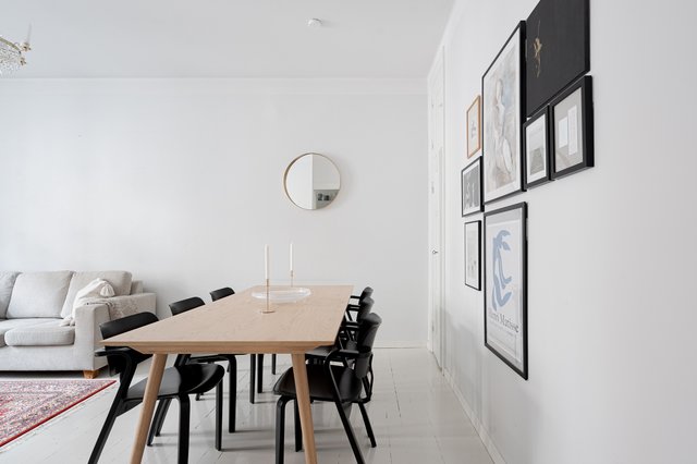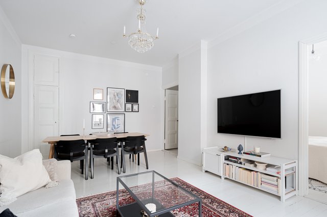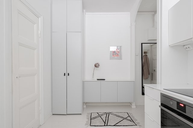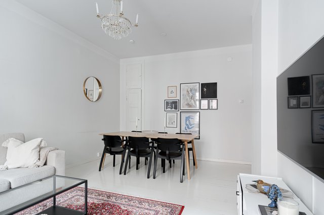 Suuri ja valoisa olohuone toimii kodin sydämenä ja tilaan mahtuu helposti niin sohvaryhmä kuin suuri ruokapöytäkin. Korkeat ikkunat ja kauniit lautalattiat tuovat asuntoon avaruutta ja valoa. Samasta tilasta löytyy myös vaatehuone, joten säilytystilaa asunnossa riittää runsaasti.
