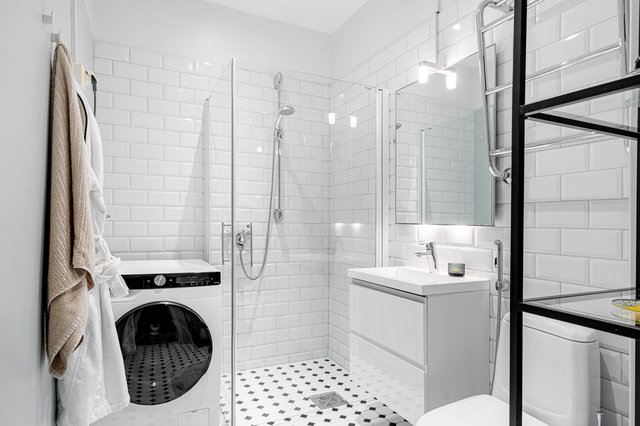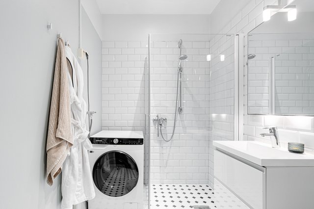 - WC-istuin, suihku, suihkuseinä, pesukoneliitäntä, peili, ja bidee-suihku