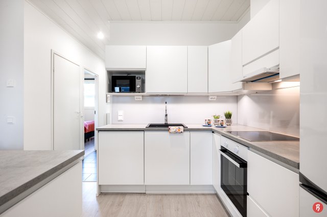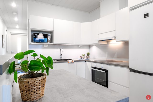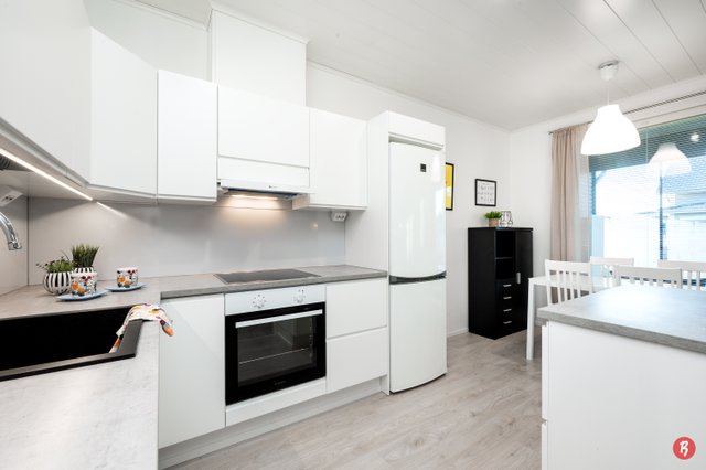 - Tyylikäs perusvarustelulla oleva keittiö saarekkeella.