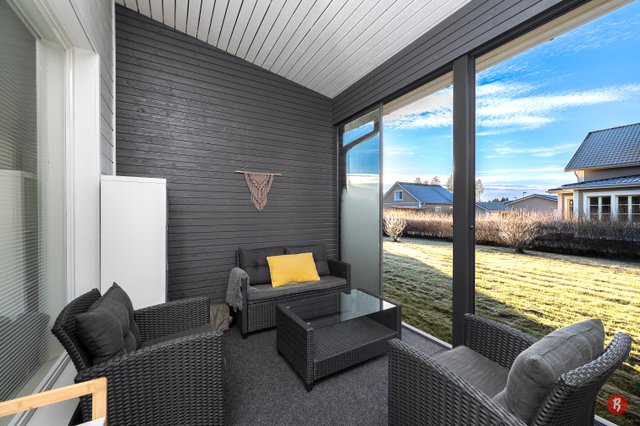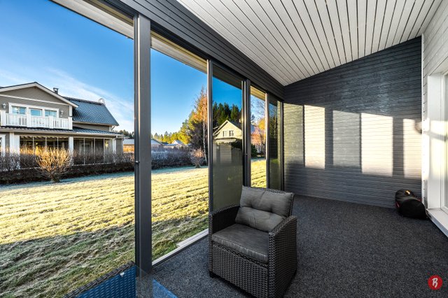 - Olohuoneen, keittiön ja ruokailutilan yhdistelmä, kulku isolle lasitetulle terassille.