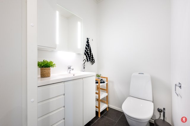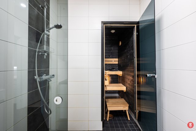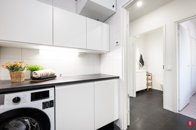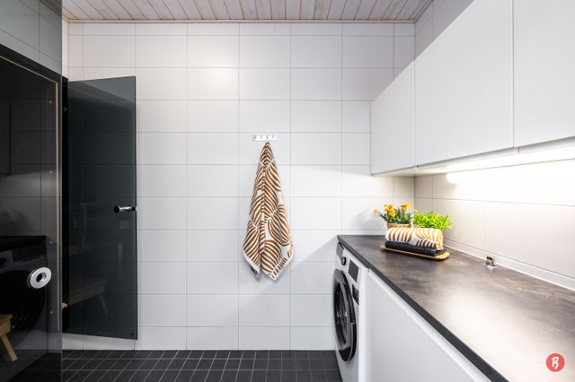 - Suihku, pesukoneliitäntä, lattialämmitys, suihkuseinä, peilikaappi, ja kaapistot