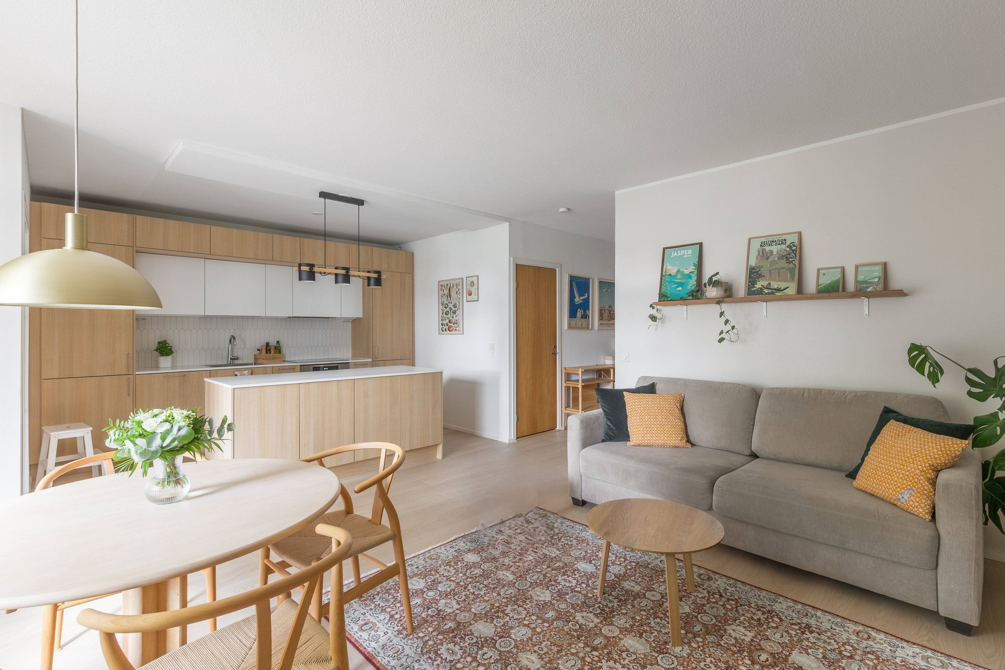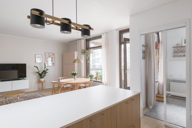 Asunnossa on tilava olohuone, joka yhdistyy saumattomasti moderniin avokeittiöön. Keittiö on täysin uusittu vuonna 2023, ja se on varustettu laadukkailla Puustellin kaapistoilla, Mielen ja AEG:n kodinkoneilla sekä suurella saarekkeella, jonka laatikostoissa on paljon säilytystilaa. Aamiaiskaappi viimeistelee tämän kokonaisuuden.