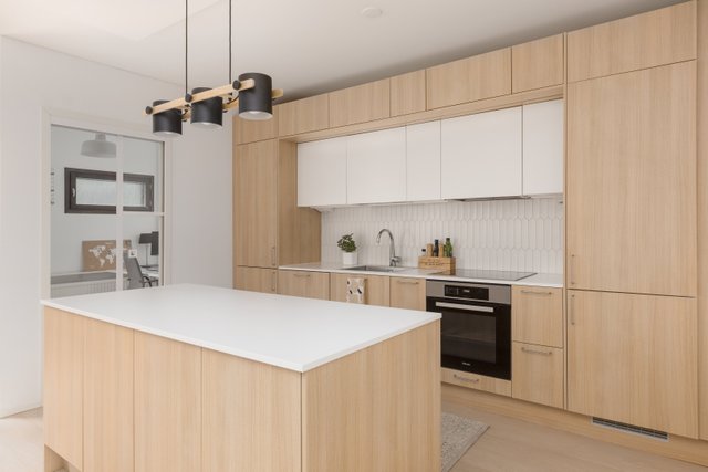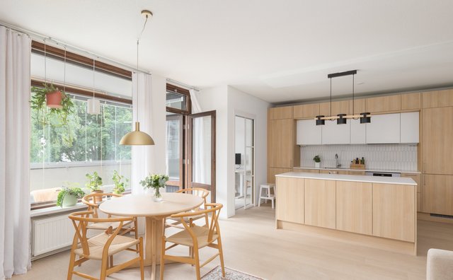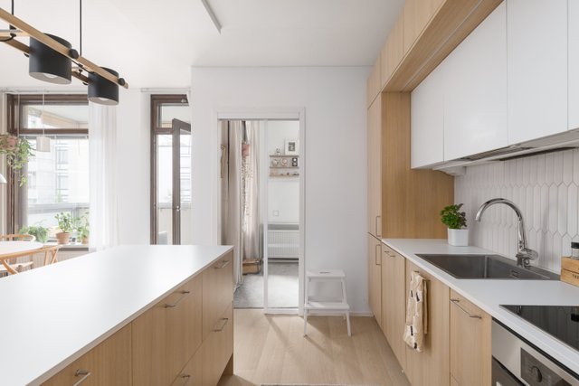 - Keittiöremontti 2023. Varustus: Puustellin kaapistot, Miele induktioliesitaso, Miele pyrolyysiuuni, AEG jääkaappipakastin, Miele integroitu astianpesukone. Aamiaiskaappi (johon saat esim. kahvinkeittimen, leivänpaahtimen ym). Suuri saareke jossa runsaasti säilytystilaa vetolaatikostoissa. Lattialla kulutusta kestävä vinyylilankku, seinät maalattu.