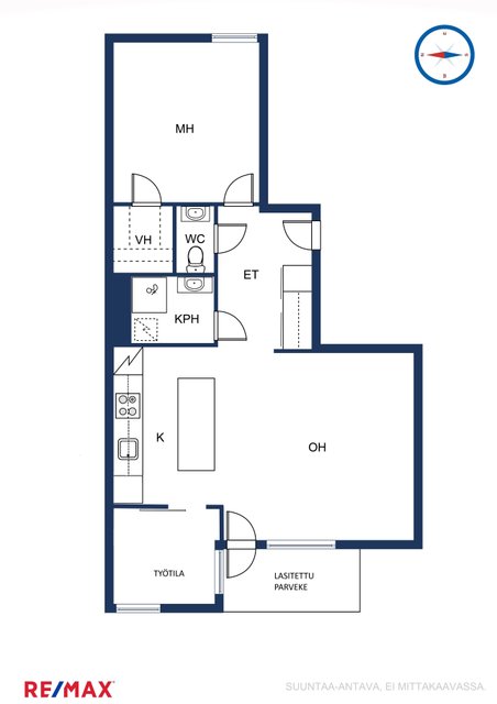 - Läpitalon huoneistossa, jossa makuuhuoneen ikkunat suuntautuu itään, sisäpihan puolelle. Olohuone ja parveke länteen. Työtilan/kotitoimiston ikkuna on parvekkeelle.