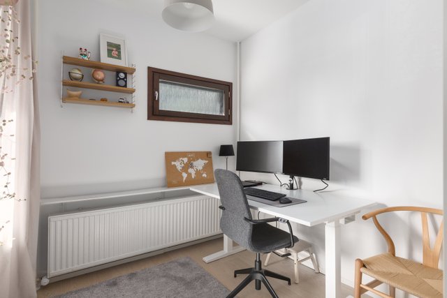 - Työtila/kotitoimisto (n. 5,5 m²) on rakennettu entiseen ruokailutilaan ja erotettu lasiliukuovella olohuoneesta. Se ei täytä asuinhuoneen määritelmään liian vähäisen lattiapinta-alan vuoksi.