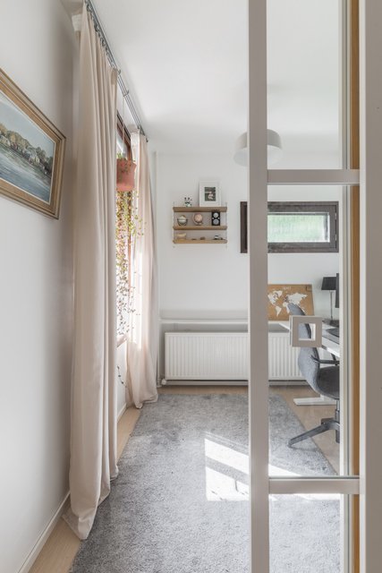 Entiseen ruokailutilaan on nyt rakennettu kätevä työtila/kotitoimisto. Se on erotettu suhteellisen hyvin ääntä eristävällä lasiliukuovella olohuoneesta ja keittiöstä.