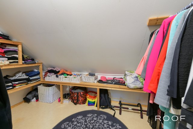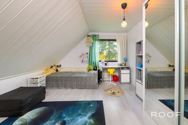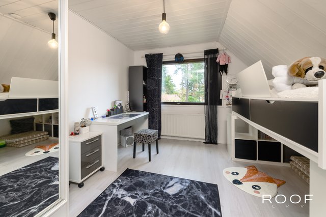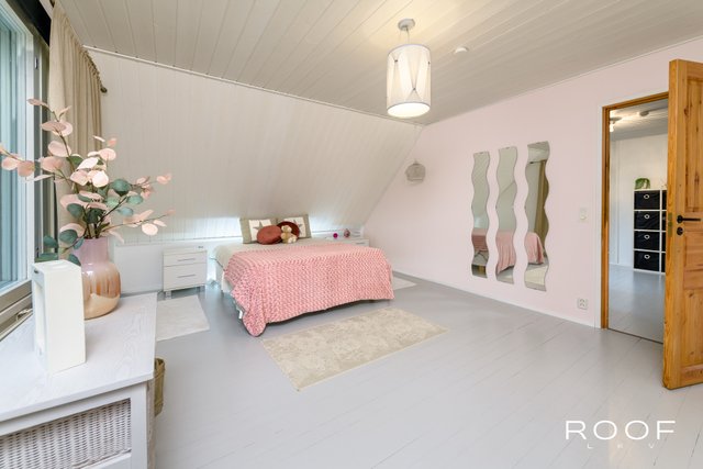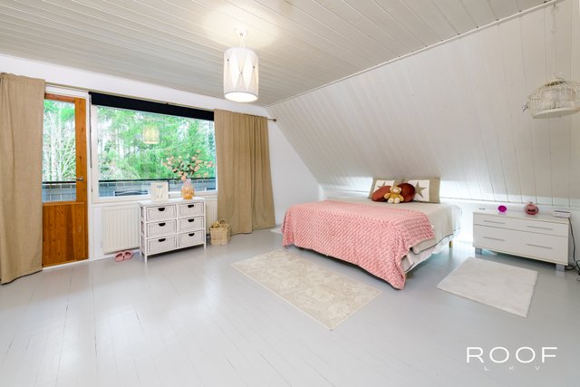 Yläkerrassa käsitelty lautalattia, kodin toinen olohuone sekä kolme makuuhuonetta, joista suurimmassa oma vaatehuone ja parveke takapihan suuntaan.
