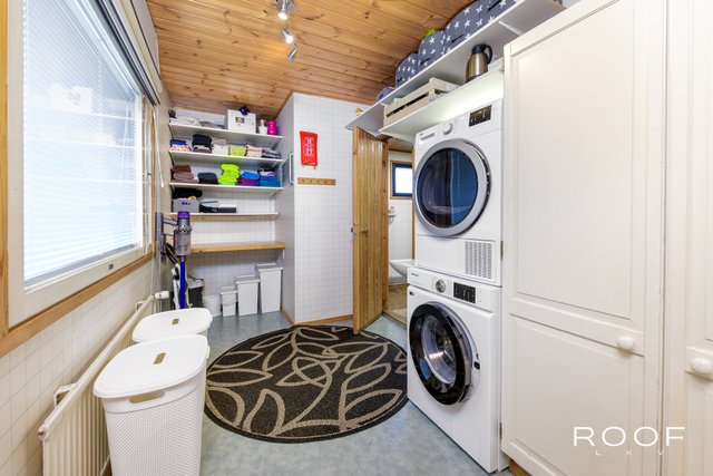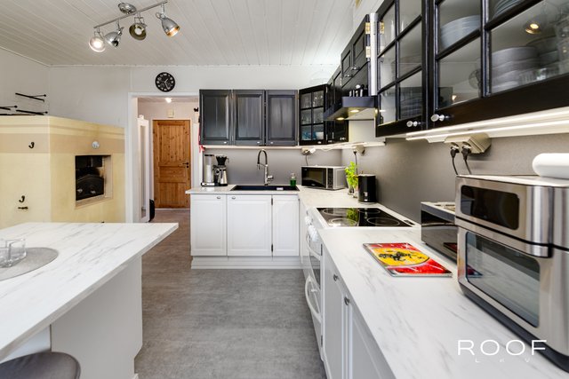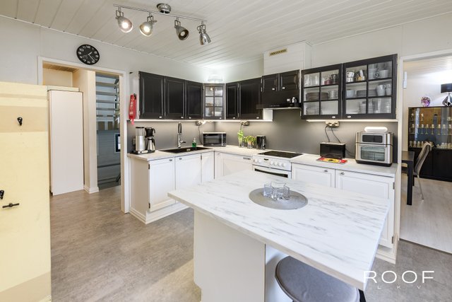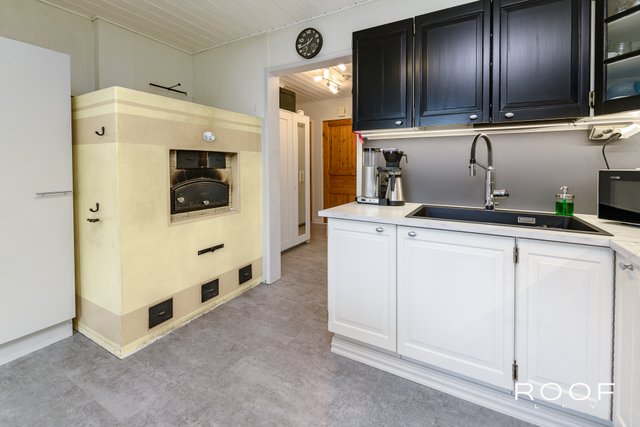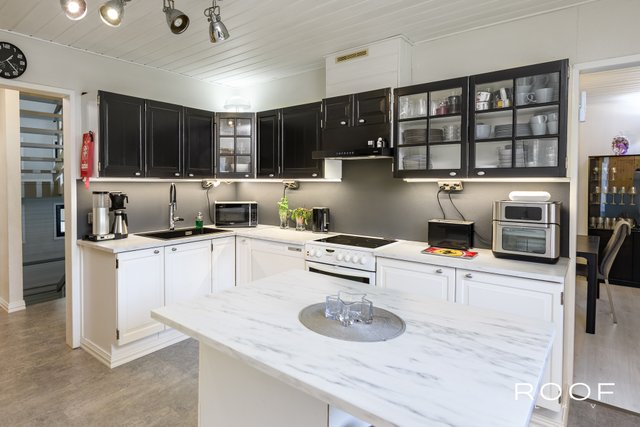 - VARUSTUS: Kaapistot, jääkaappi, pakastinkaappi, astianpesukone, keraaminen liesi/kiertoilmauuni, liesituuletin (v. 2023), komposiitti pesuallas (Blanco Silgranit) ja leivinuuni, keittiön kaapiston ovet hiottu ja maalattu, työtasot, pesuallas, hana, liesituuletin ja sähköt uusittu. Käyttövesiputket uusittu kellariin saakka. LATTIA: Vinyylilankku