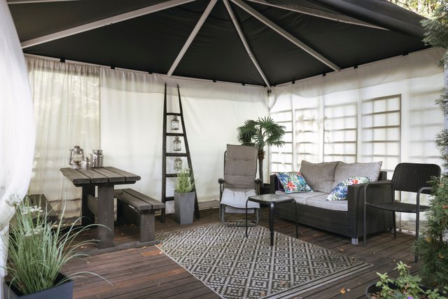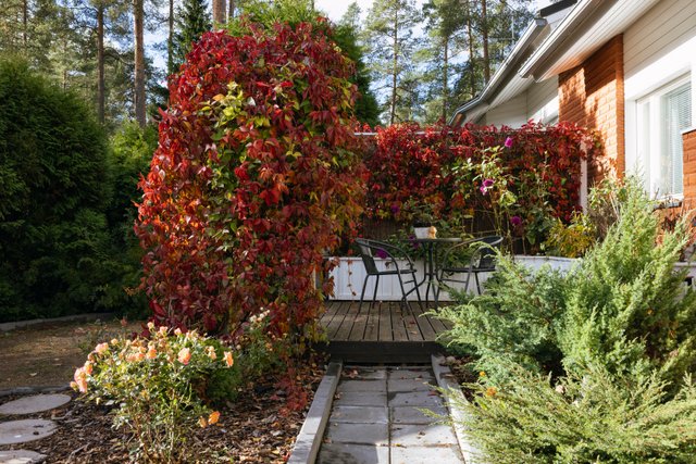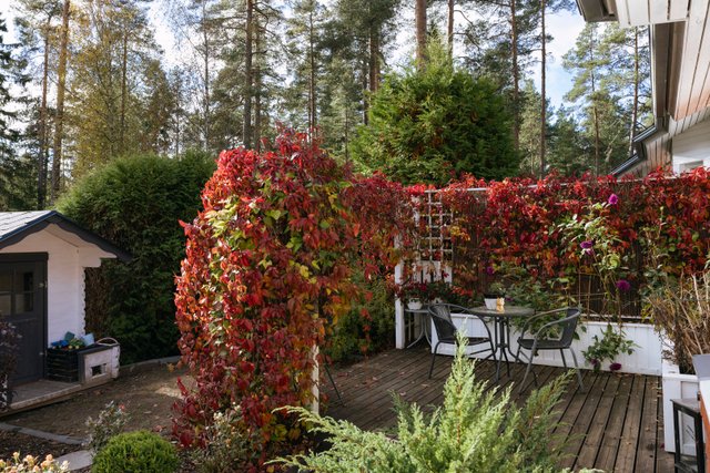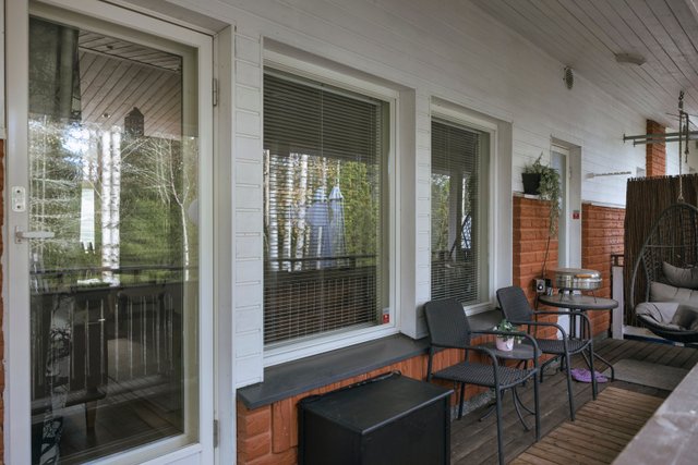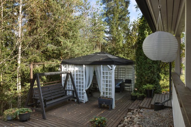 - Isot terassit takapihalla, tontti rajoittuu metsään. Paviljonki kuuluu kauppaan. Terassille kulku sekä khh:sta, että olohuoneesta.