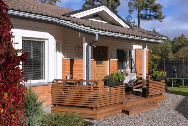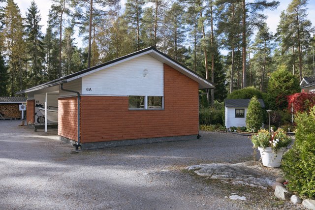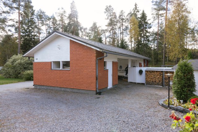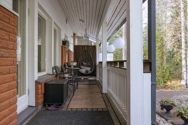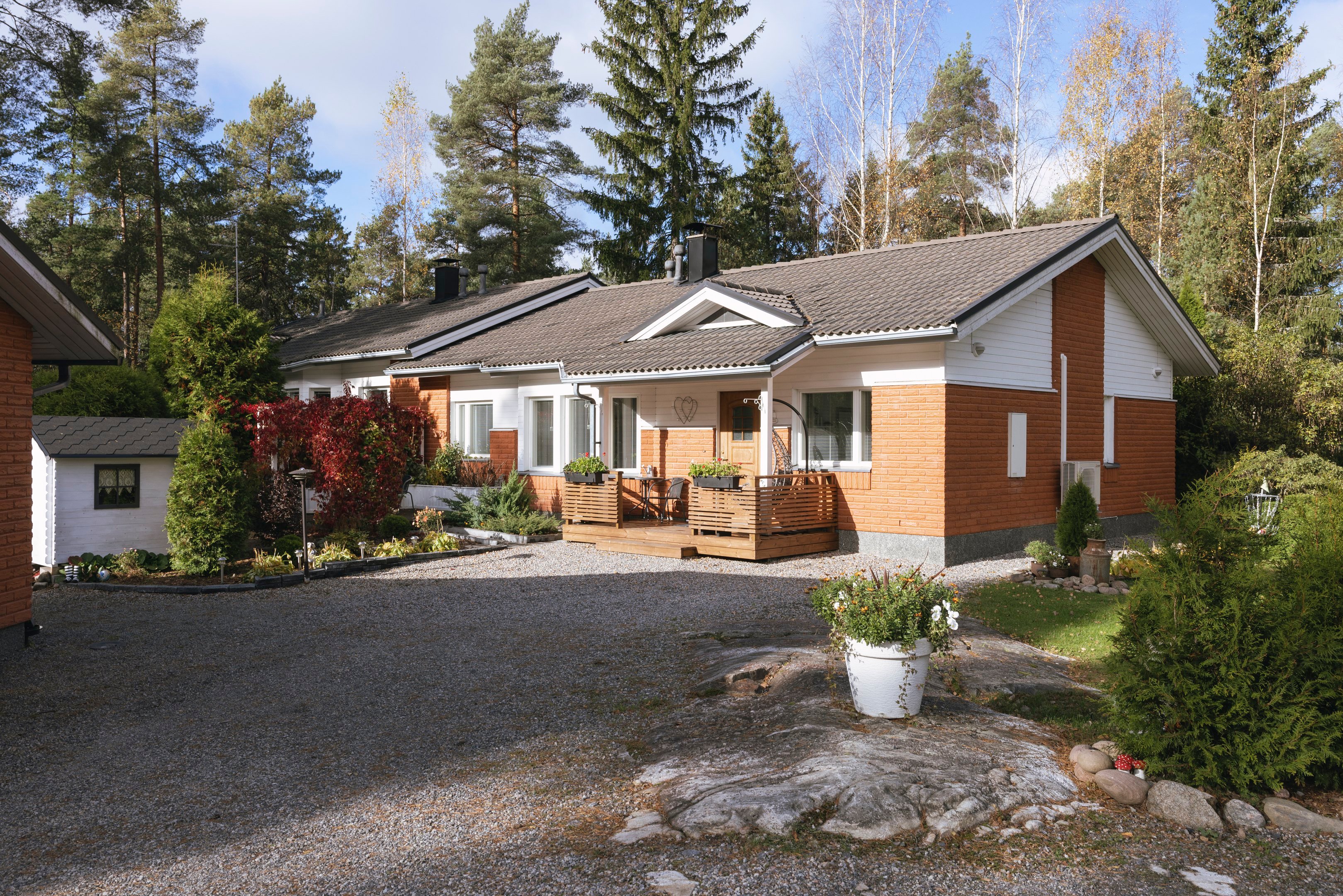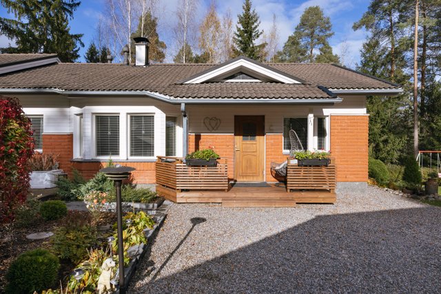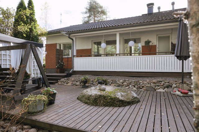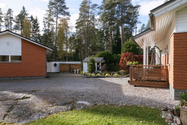 Hyvin hoidetut ja selkeät piha-alueet kutsuvat lämpimästi tervetulleeksi. Aamukahvit etupihan patiolla ja illanviettoa takapihan viihtyisällä metsään rajoittuvalla terassilla. Autolle suoja katoksen alla, jonka yhteydessä myös varasto.