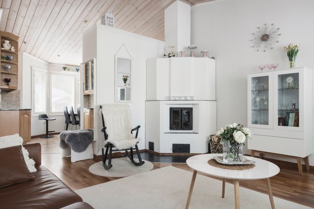 - Lattia parkettia, seinät maali/tapetti. Viisto katto, varaava takka.