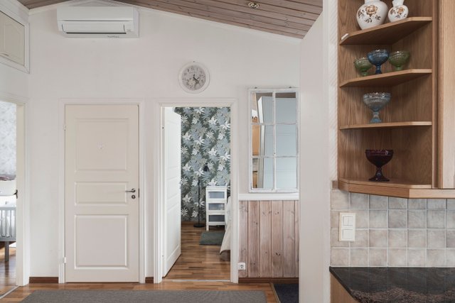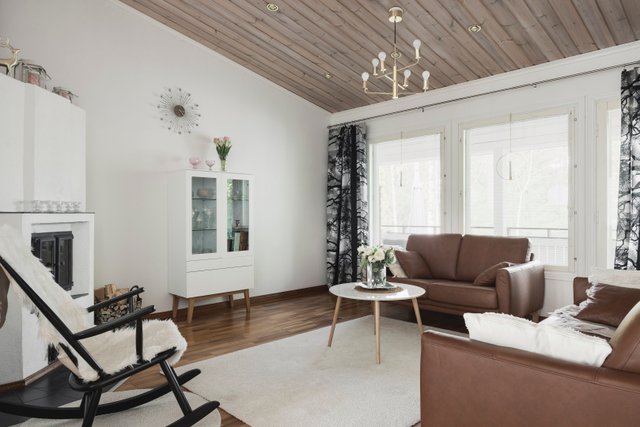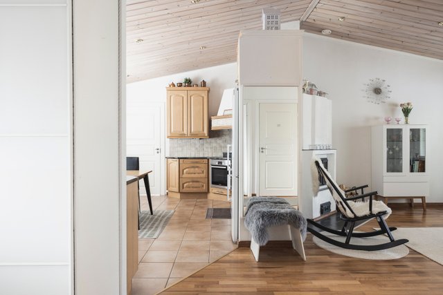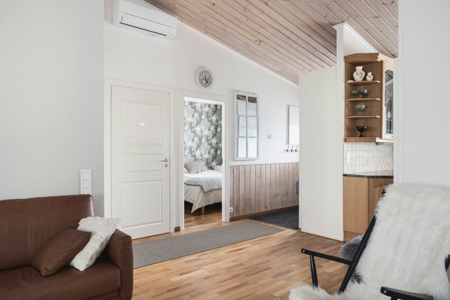 Asunnon pohjaratkaisu on Kastellitalolle tyypillisen toimiva. Tilava Puustellin täyspuukeittiö kivitasoilla tarjoaa tilaa kokkailuun ja yhdessäoloon erkkerin edustalla isommankin ruokailuryhmän äärellä. Viisto katto olohuoneessa tuo avaruutta, varaava takka tunnelmaa ja lämpöä. Takapihan terassille on kulku olohuoneen lisäksi pesutiloista, joten saunasta pääset suoraan terassille vilvoittelemaan. Kodinhoitohuoneen yhteydessä on käytännöllinen vaatehuone säilytystä varten. Yksi pienempi ja kaksi isompaa makuuhuonetta.