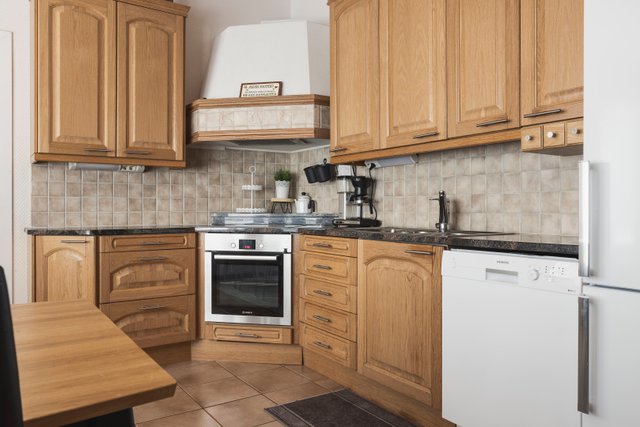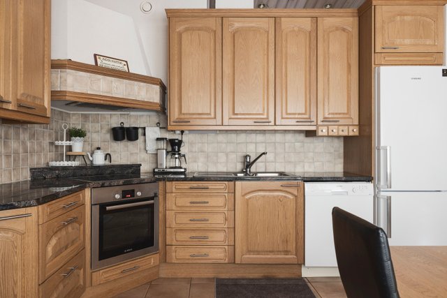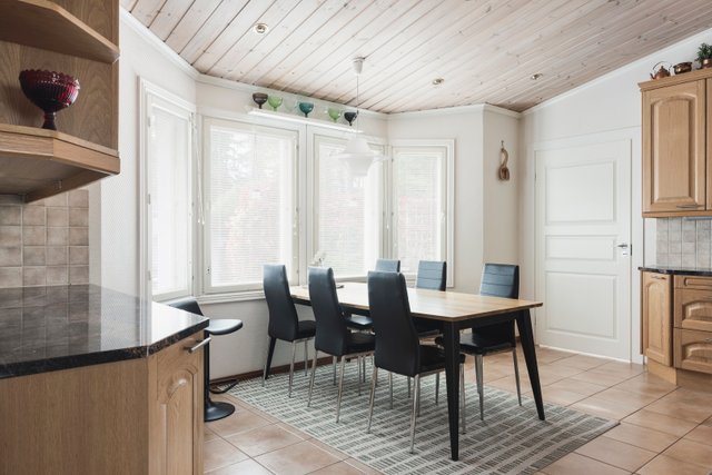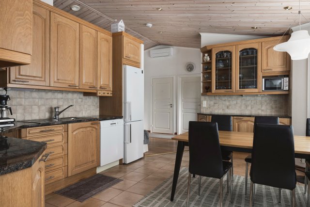 - Puustelli keittiö (täyspuu), kivitasot, jääkappi/pakastin, induktioliesi, erillisuuni, liesituuletin, astianpesukone. Lattia laattaa, seinät tapetti/maali. Tila isolle ruokailuryhmälle erkkerin edustalla.