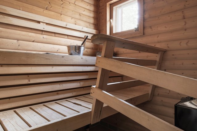 - Ikkunallinen sauna. Lattia laattaa, seinät puuta.