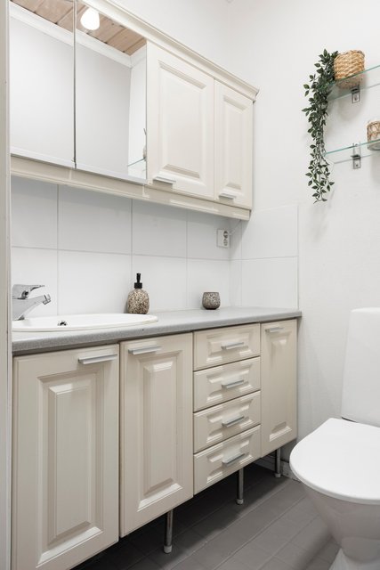 - Lattia laattaa, seinät maalatti/tapetti. Varustukset: lattialämmitys, bidee suihku, kaapistot, wc-istuin.