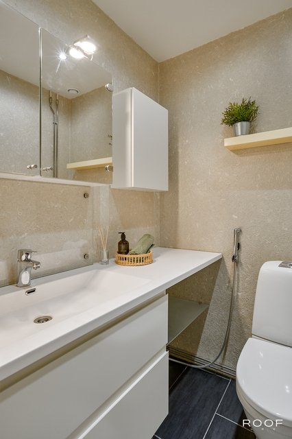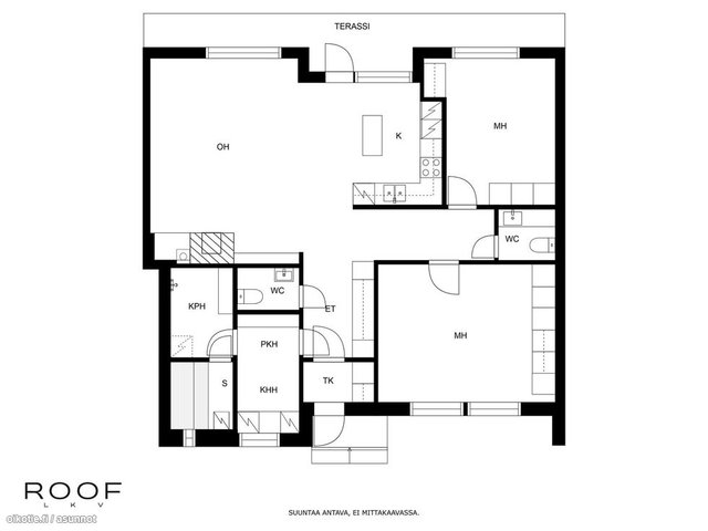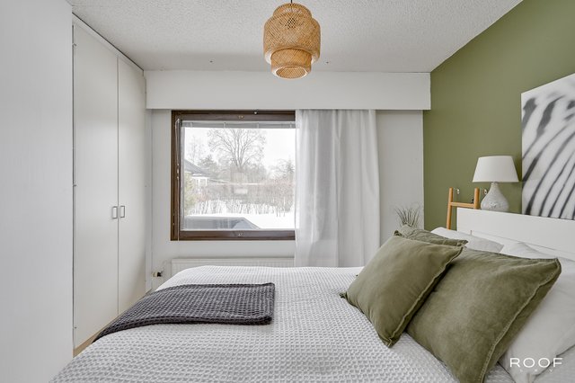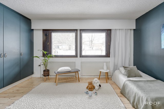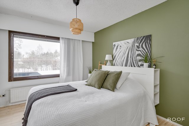 Kaksi makuuhuonetta tarjoavat mukavasti omaa rauhaa ja suuremman makuuhuoneen voi tarvittaessa jakaa kahdeksi alkuperäisen pohjapiirroksen mukaisesti. Asunnossa on myös kaksi erillistä wc:tä, tilava kylpyhuone ja oma sauna. Kesällä aamukahvin voi nauttia omalla terassilla!