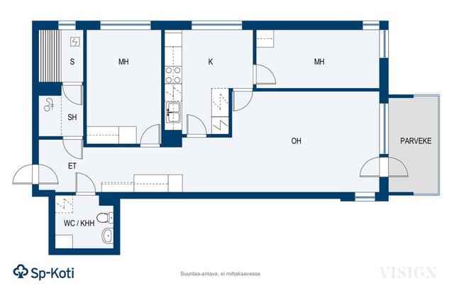 Keittiö on varusteltu nykyaikaisesti, ja sieltä löytyy muun muassa astianpesukone ja saareke, joka tarjoaa runsaasti työskentelytilaa. Olohuoneesta on käynti lasitetulle parvekkeelle, jonne aurinko paistaa mukavasti. Parveke on täydellinen paikka nauttia aamukahvista tai rentoutua iltaisin.