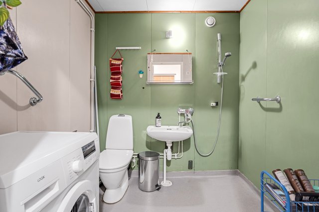 - WC-istuin, pesukoneliitäntä, suihku, peilikaappi, ja pesuallas