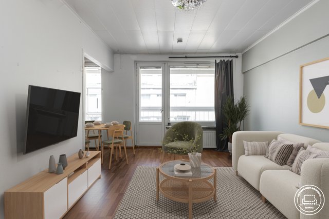 Asunnossa on toimiva pohjaratkaisu. Olohuoneen yhteydessä on alkovi, vaatehuoneessa hyvin säilytystilaa ja olohuoneeseen avautuvassa keittokomerossa kaikki tarpeellinen ruuanlaittoon ja arkea helpottamaan myös astianpesukone. Olohuoneesta on käynti koko asunnon levyiselle lasitetulle parvekkeelle.