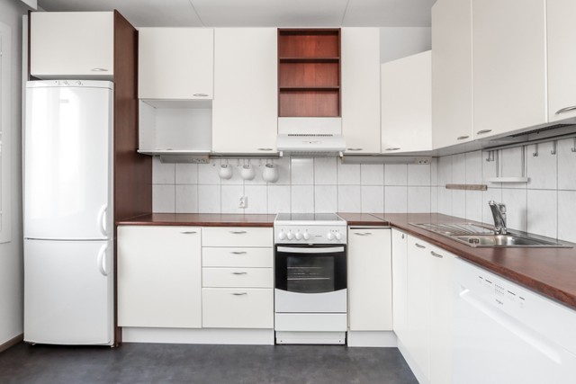 - Jääkaappipakastin, liesituuletin, astianpesukone, uuni, ja liesi