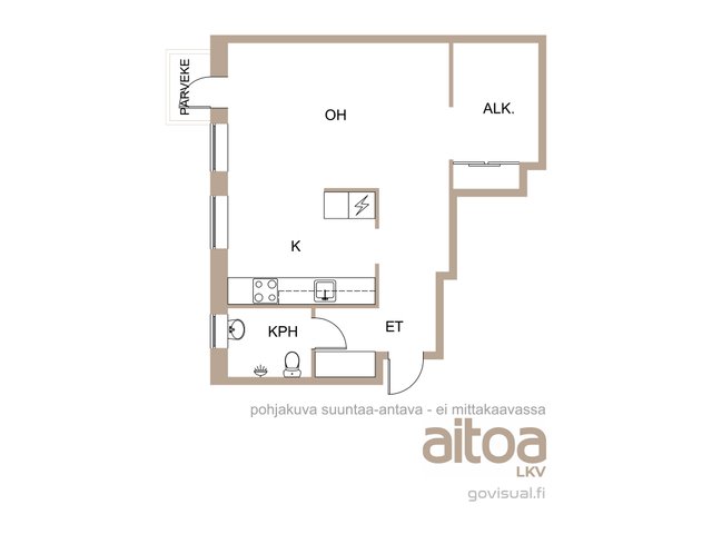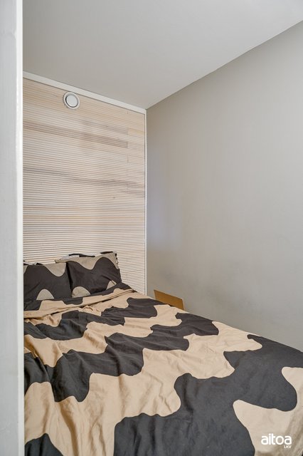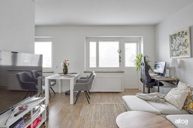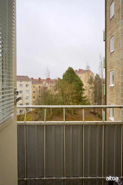 Oma pieni parveke avautuu etelään, tarjoten rauhalliset näkymät ja mahdollisuuden nauttia auringosta.