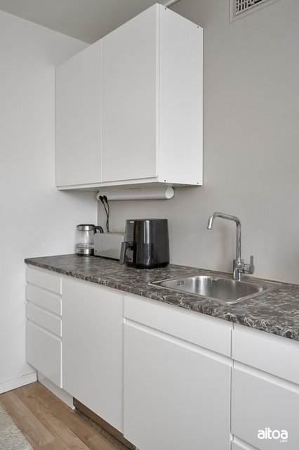- 2021 remontoitu keittiö, jonka yhteydessä keittiön ja olohuoneen seinää avattu.