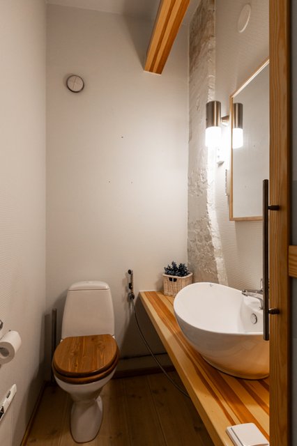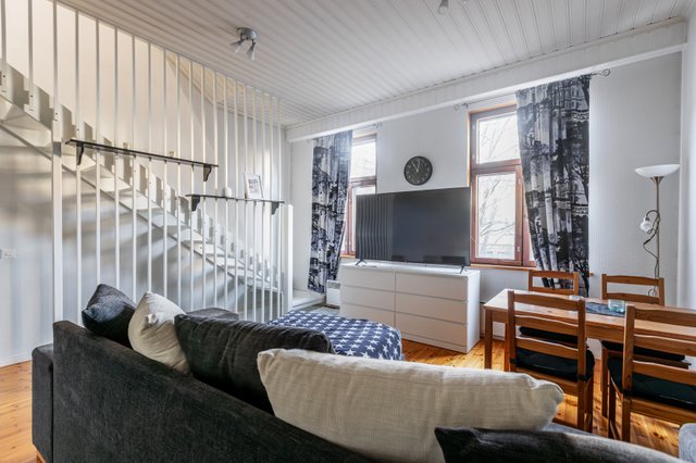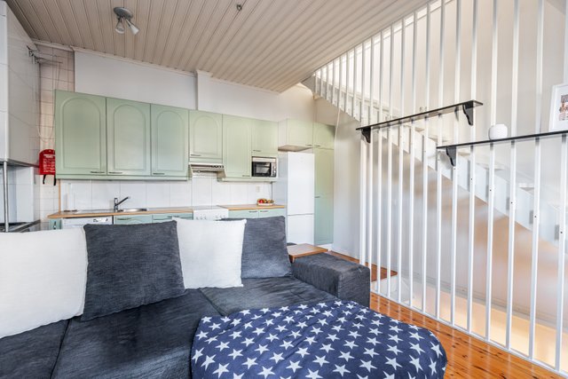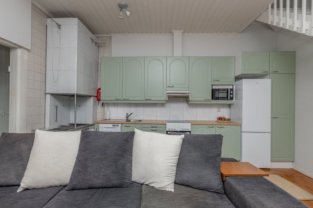 Asunnon tilat jakautuu kolmeen kerrokseen. Keskikerroksen 27 m²:n tilat tarjoavat viihtyisän olohuoneen, keittiön sekä eteisen. Keittiössä on tunnelmallinen puuliesi. Ullakolta löytyy tilava makuuhuone ja wc sekä kellarikerroksesta löytyy huonetila, wc, pesuhuone/sauna ja varasto. Kylpyhuone ja sauna on remontoitu vuonna 2015, joten ne ovat hyvässä kunnossa.