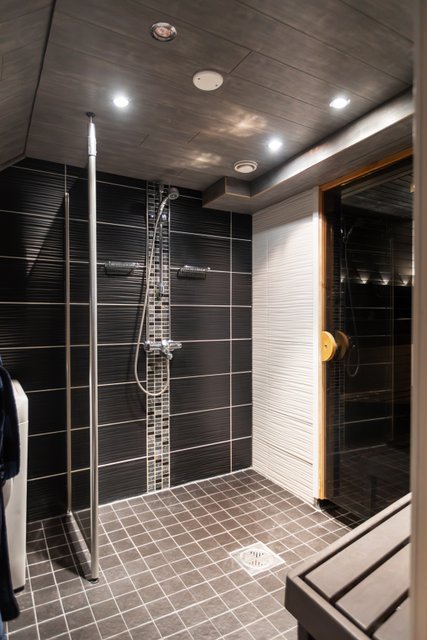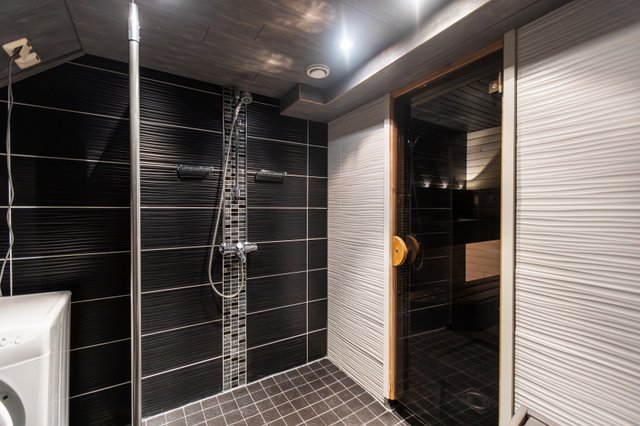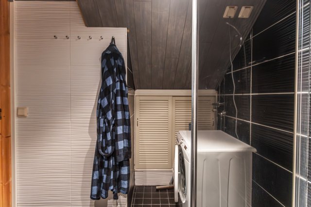 - Suihku, suihkuseinä, pesukoneliitäntä, ja lattialämmitys