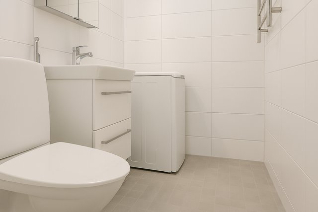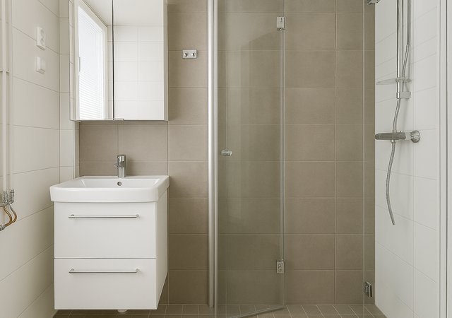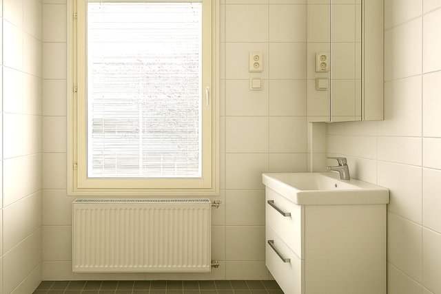 - Suihku, peili, pesuallas, pesukoneliitäntä, allaskaappi, ja peilikaappi