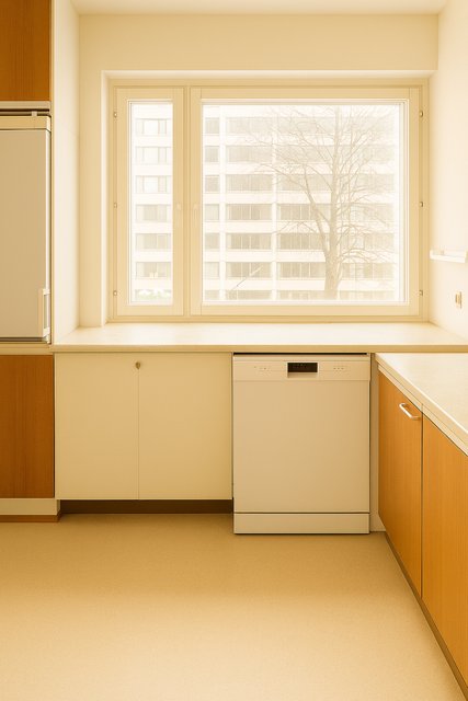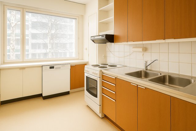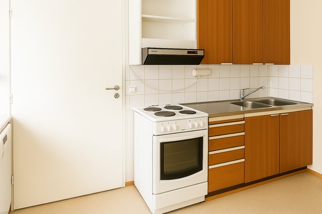 - Jääkaappipakastin, uuni, liesi, liesituuletin (aktiivihiilisuodatin), ja astianpesukone