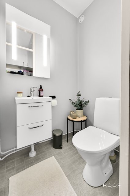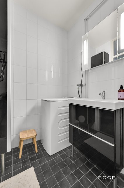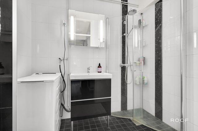 - Suihkuseinä, pesukoneliitäntä, lattialämmitys, peilikaappi, allaskaappi, pesuallas, ja suihku
