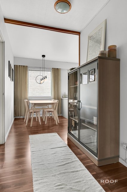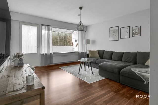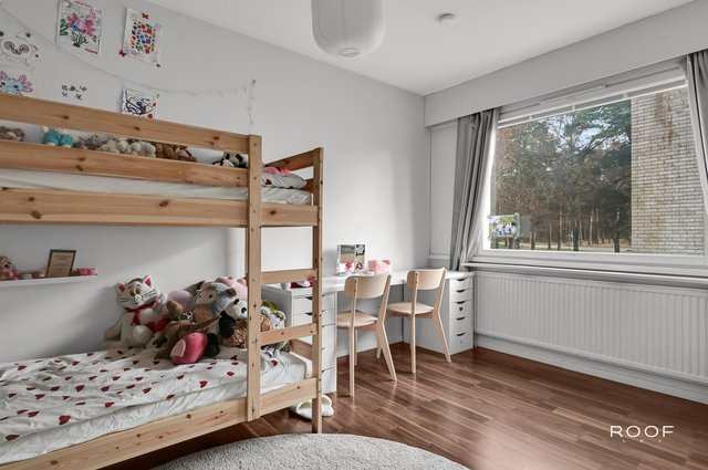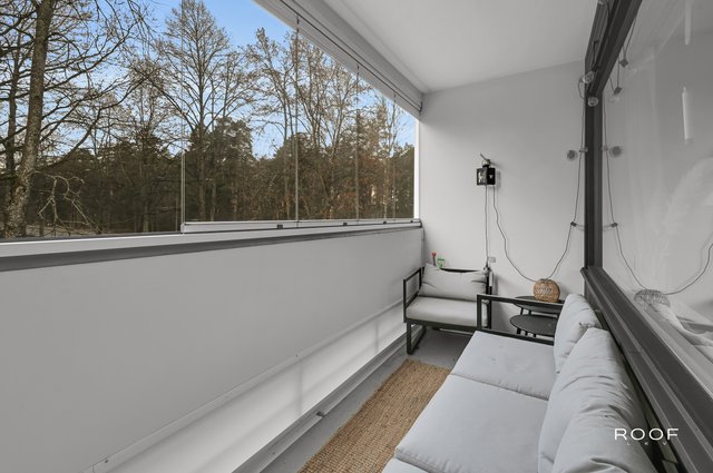 Den inglasade balkongen västerut har fin utsikt mot skogsområde. Praktiskt klädrum ger bra med förrådsutrymme.