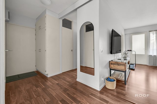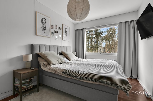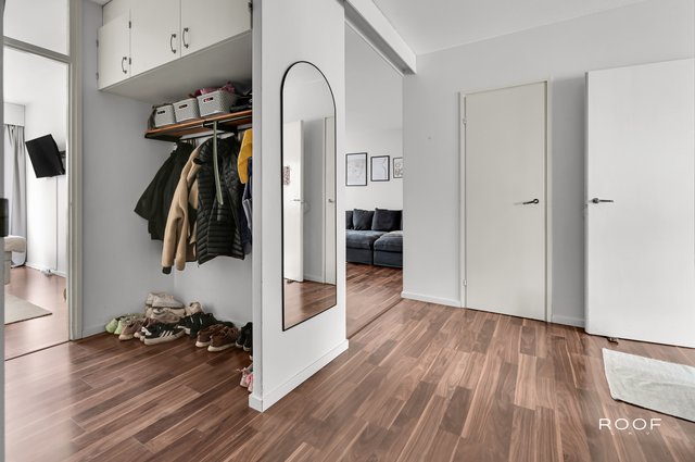 Asunnon lasitetusta parvekkeesta on näkymät metsä-alueelle. Käytännöllinen vaatehuone antaa rutkasti säilytystilaa.