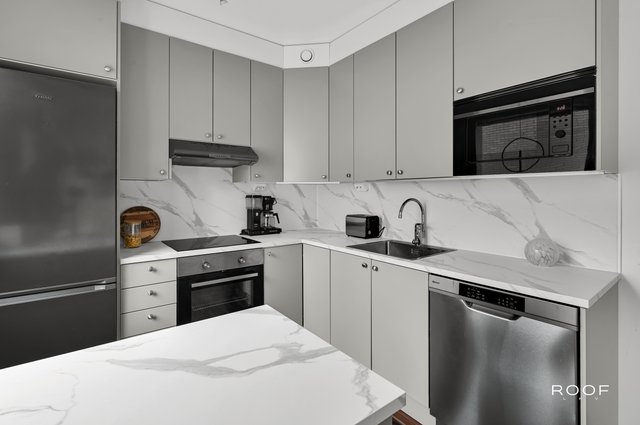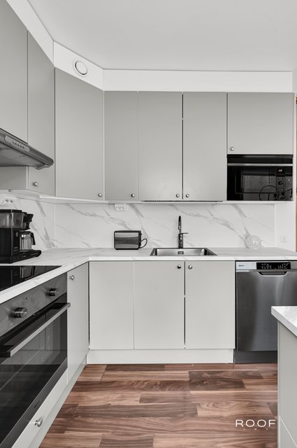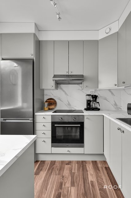 - Jääkaappipakastin, erillisuuni, astianpesukone, keittiösaareke, liesituuletin, ja liesi