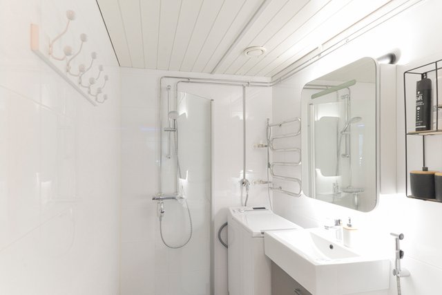 - WC-istuin, suihku, suihkuseinä, pesukoneliitäntä, allaskaappi, peili, ja pesuallas