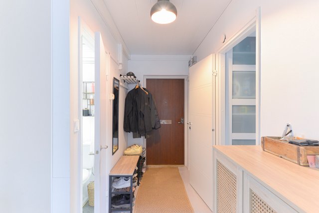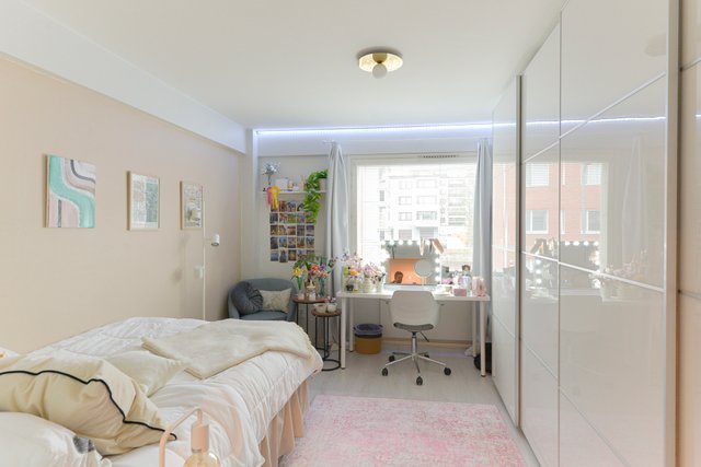 Valoisa ja toimiva pesuhuone on viimeistelty tyylikkäästi ja kaksi makuuhuonetta tarjoavat runsaasti säilytystilaa suurine kaapistoineen. Tilava olohuone kutsuu viihtymään – tänne mahtuu helposti myös etätyöpiste ilman, että tilan tuntu kärsii.