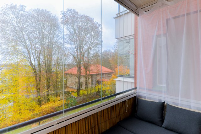 Länteen suuntautuva parveke lisää asumismukavuutta ja tarjoaa upeat näkymät kohti satamaa. Täällä voit nauttia ilta-auringosta ja kaupungin tunnelmasta omassa rauhassasi.