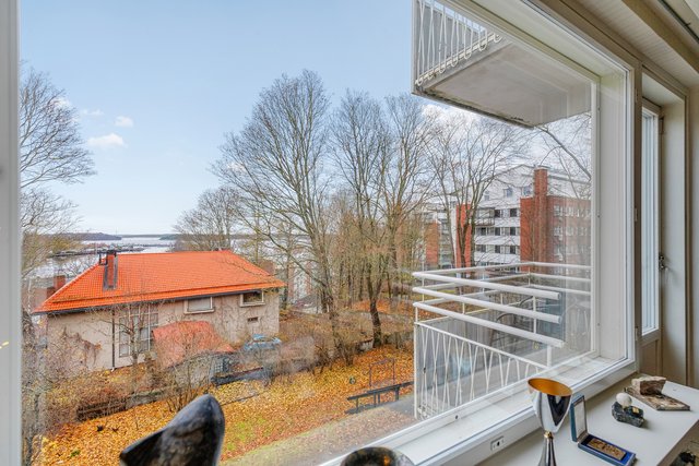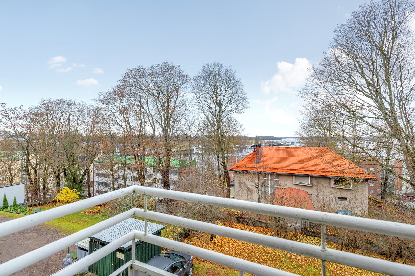 Tämä läpitalon huoneisto sijaitsee toisessa kerroksessa ja sieltä avautuvat upeat näkymät niin Saimaalle, satamaan kuin linnoitukseen. Tilavassa olohuoneessa, sekä ruokailutilassa ja kahdessa makuuhuoneessa on laminaattilattia. Kylpyhuoneessa on pesukoneliitäntä, joten arjen askareet sujuvat vaivattomasti.
