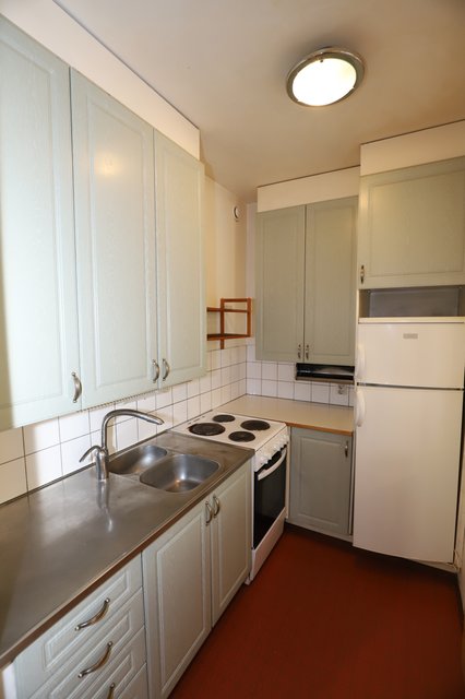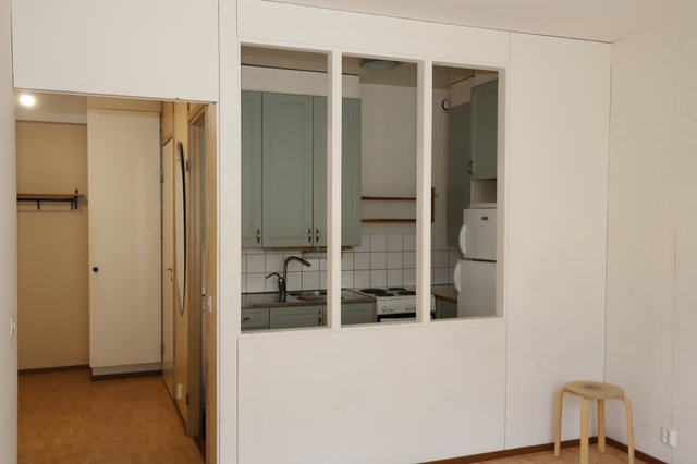 Asunnon pohjaratkaisu on toimiva, ja 42,5 neliömetriä tarjoaa sopivasti tilaa niin yksinasuvalle kuin pariskunnallekin. Huoneistossa on tilava vaatehuone, joka tuo lisää säilytystilaa.