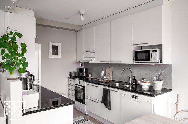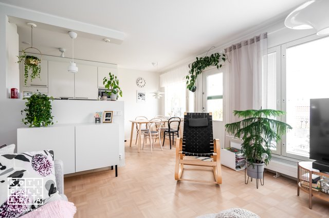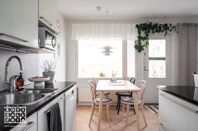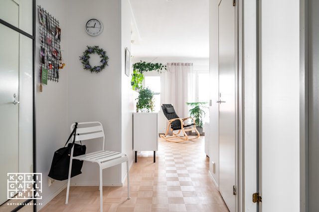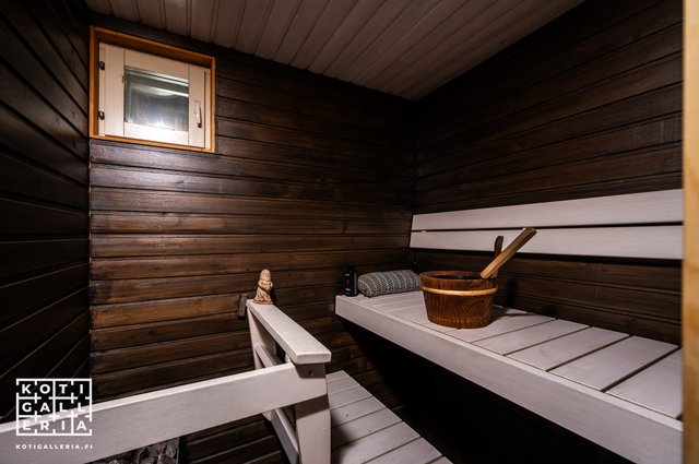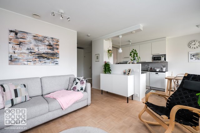 Avara olohuone ja keittiö muodostavat yhtenäisen tilan, josta on käynti lasitetulle etelä-länsisuuntaiselle terassille. Kokonaan uudistetussa kauniissa valkoisessa keittiötilassa tummat kivitasot tuovat mukavasti kontrastia. Makuuhuoneesta pääsee tilavaan vaatehuoneeseen ja kylpyhuoneen ja saunan yhteydessä on käytännöllinen kodinhoitotila.