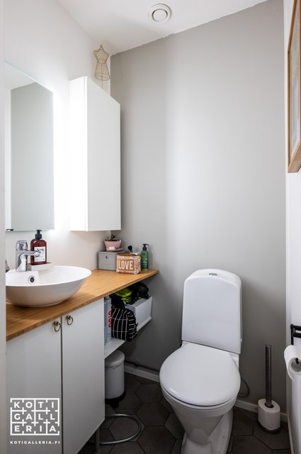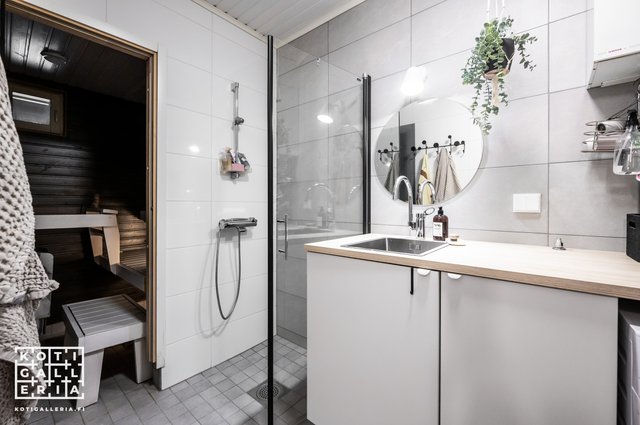 - Suihkuseinä, pesukoneliitäntä, lattialämmitys, peili, pesuallas, allaskaappi, ja iv kone