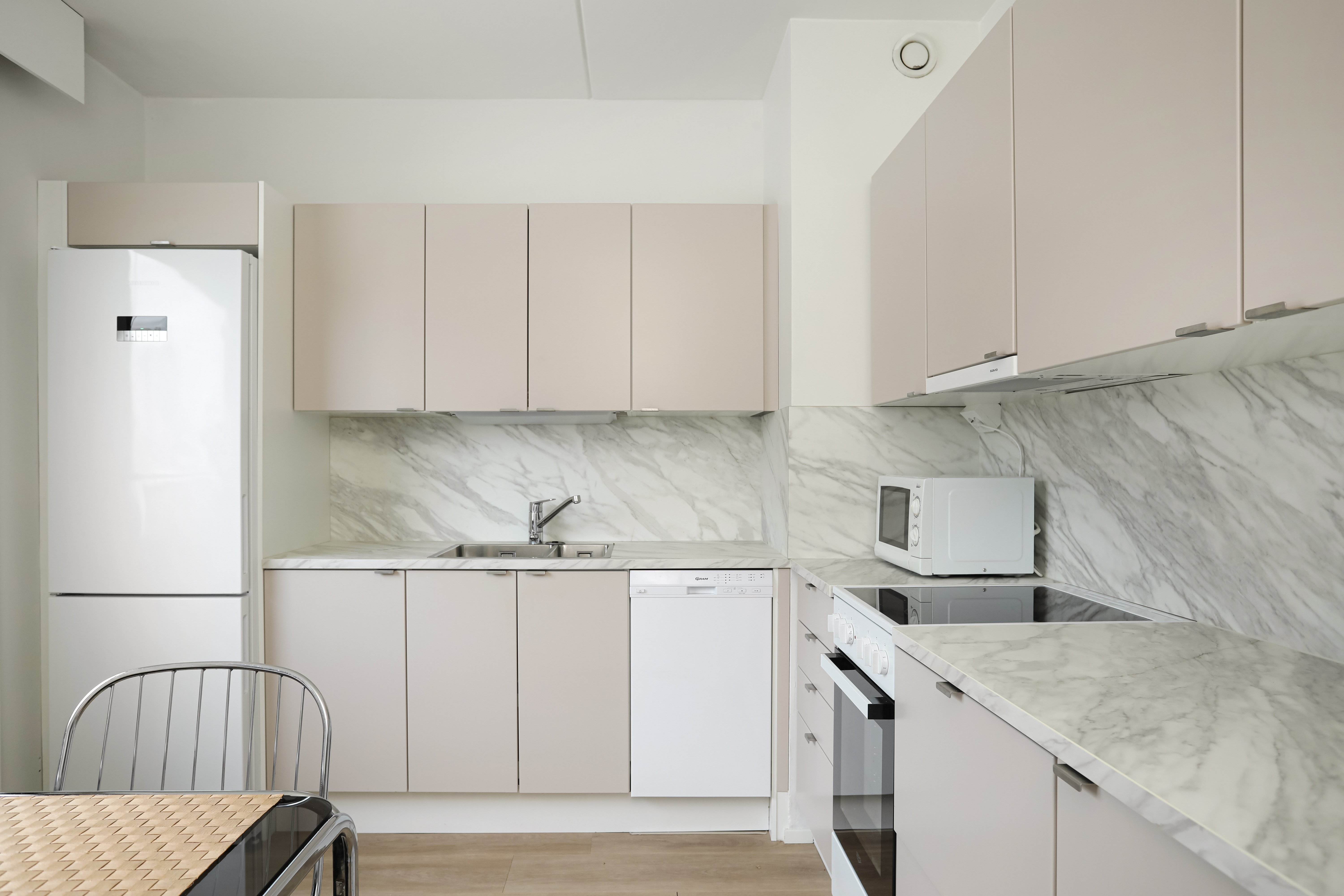 - Jääkaappipakastin, mikroaaltouuni, astianpesukone, liesituuletin, ja uuni
