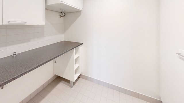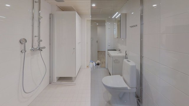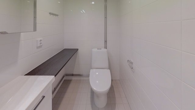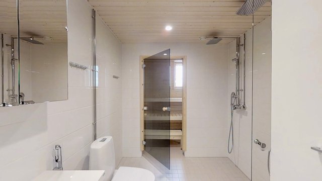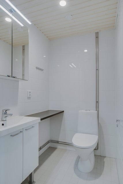- WC-istuin, suihkuseinä, pesukoneliitäntä, peilikaappi, ja allaskaappi