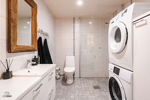 - Kylpyhuoneessa on todella siistit ja tyylikkäät laattapinnat sekä hyvin tilaa myös pesutornille. Varustus: pesukoneliitäntä, suihku, suihkuseinät, wc-istuin, allaskaappi, peili ja kiinteät valaisimet. Lattia- ja seinäpinnat laatoitettu.